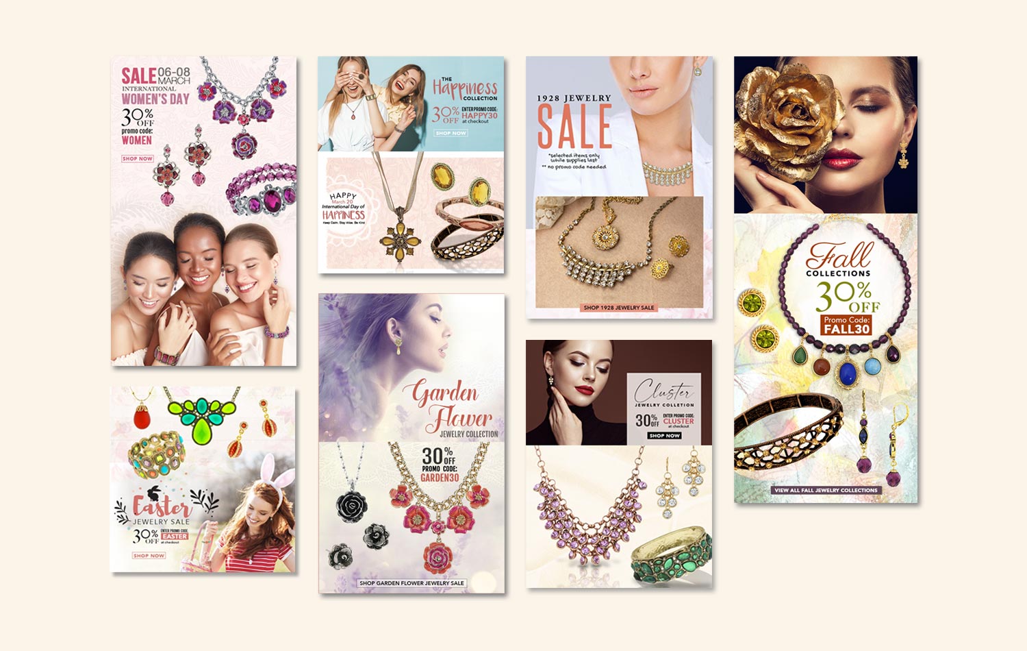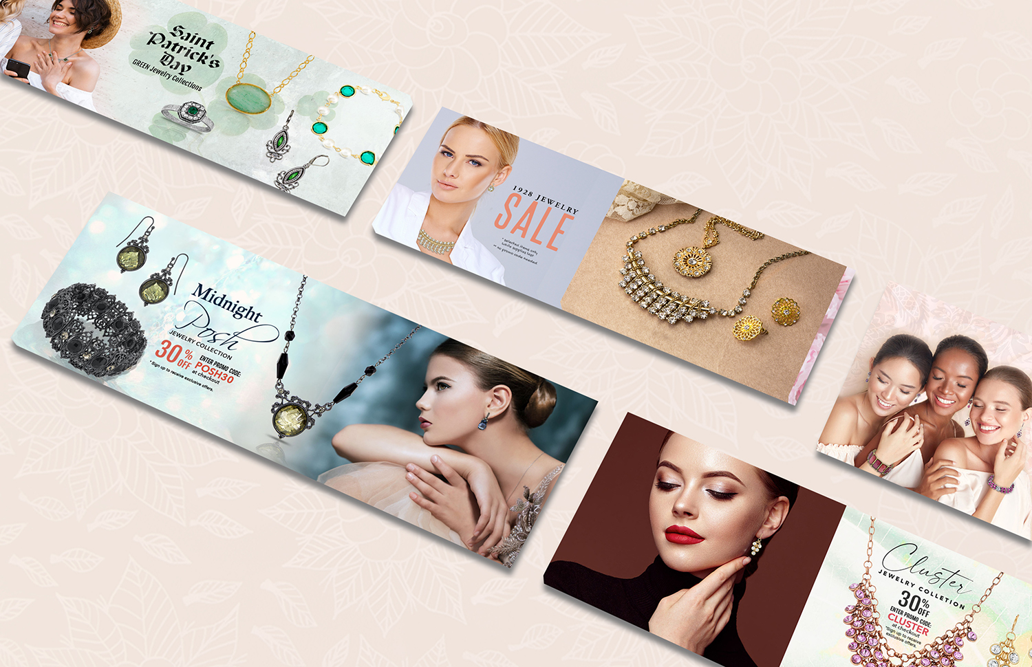 Digital campaigns for vintage style fashion jewelry promotions.